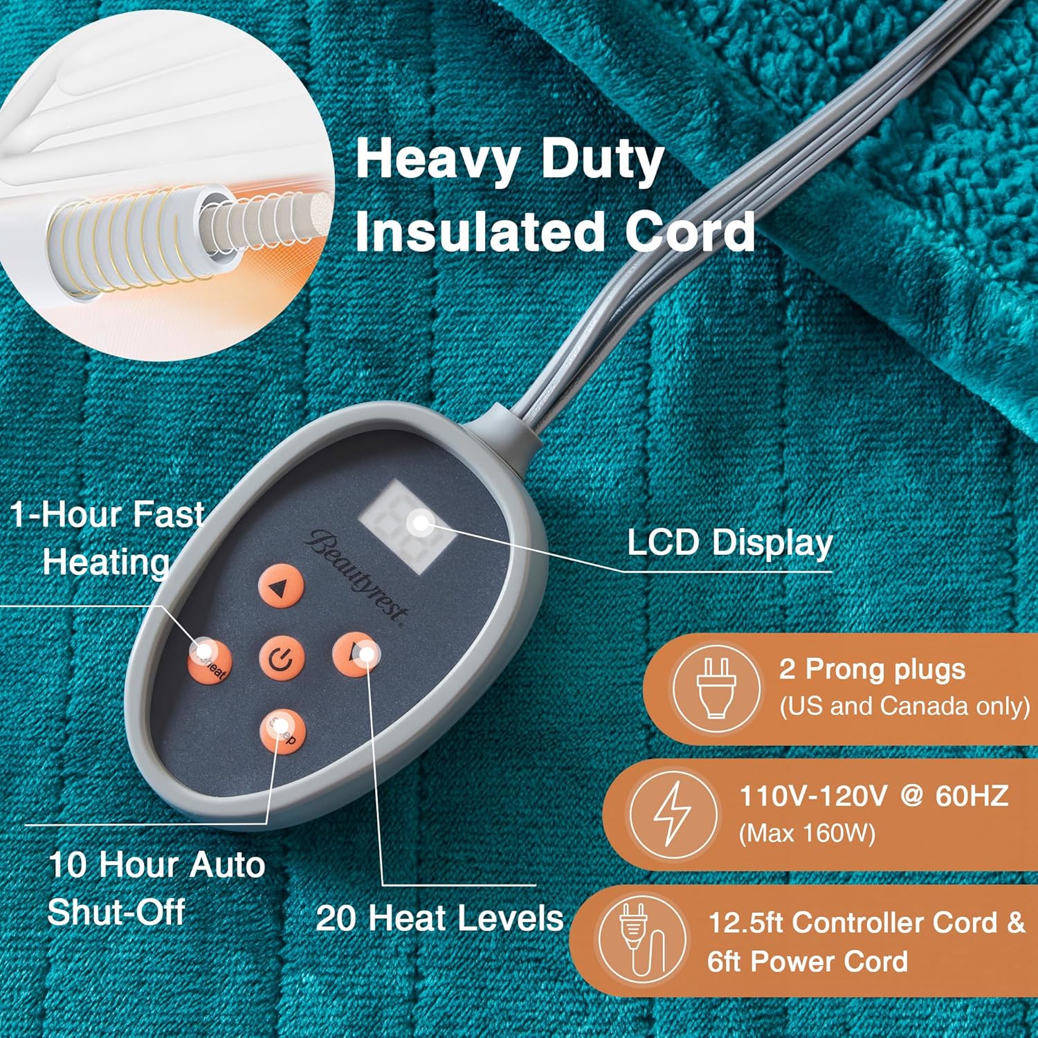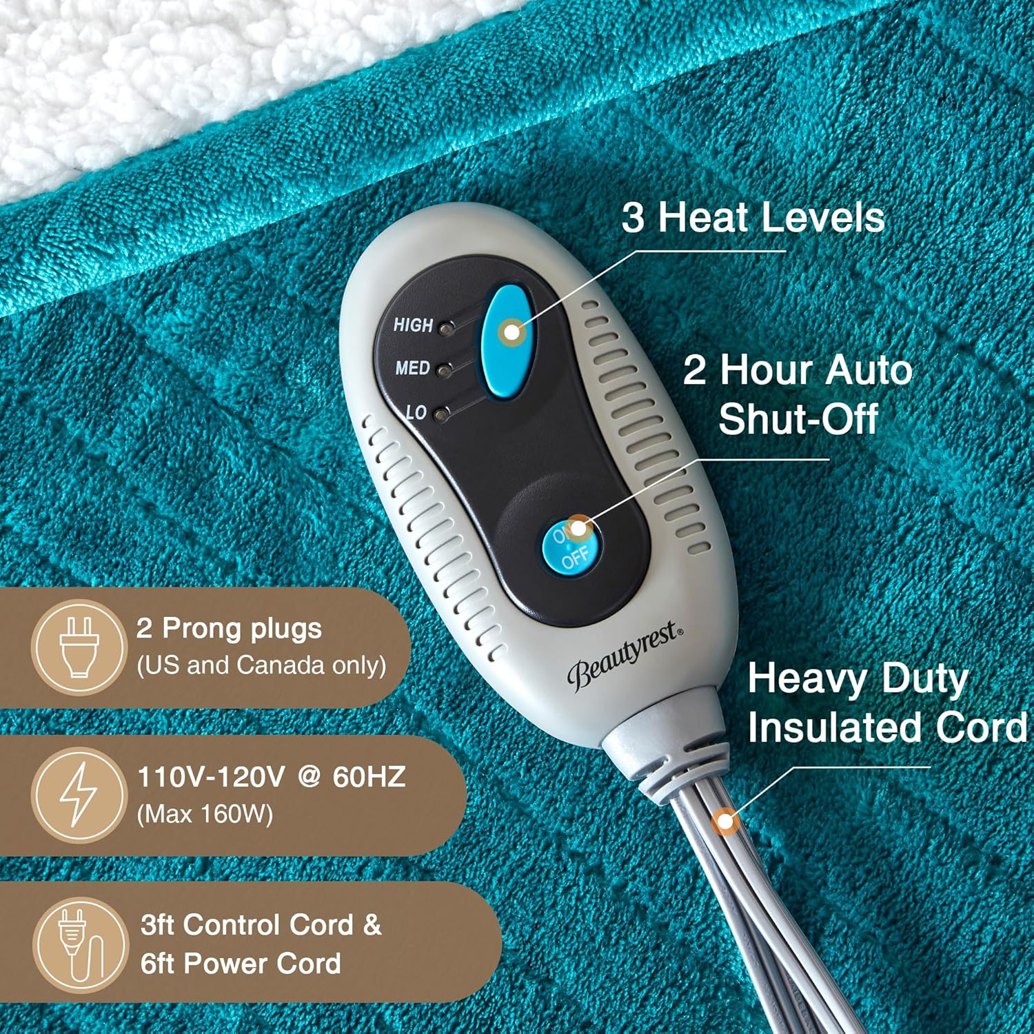 Immerse yourself in comfort in the BeautyRest Heated Microlight reverse to Berber Throw. This heated throw utilizes state of the art Secure Comfort technology that adjusts the temperature of your blanket based on overall temperature, spot temperatures and the ambient temperature of your room, ensuring a consistent flow of warmth. This unique technology also emits virtually no electromagnetic field emissions, so you can snuggle up with confidence. This throw is oversized, nearly a foot larger in the length and width compared to standard heated throws. The ultra soft microlight plush fabric combines with billowy berber in this cozy, comfortable throw. Features 3 heat settings and 2 hour auto shut off. This throw is machine washable for easy care and OEKO-TEX certified, meaning it does not contain any harmful substances or chemicals to ensure quality comfort and wellness..
